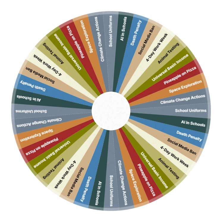 Spin the wheel to get a random, engaging debate and discussion topic for classrooms and groups.