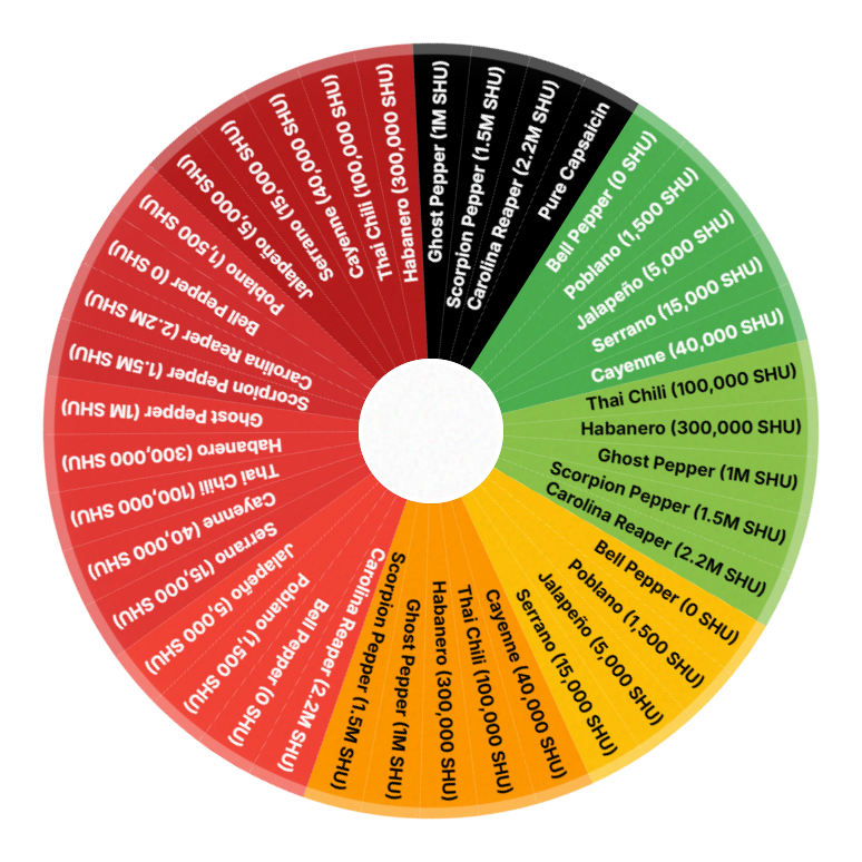Spin the Spicy Challenge Wheel to randomly select your heat level — from mild Bell Pepper to the extreme Carolina Reaper. Free, instant, no sign-up needed.
